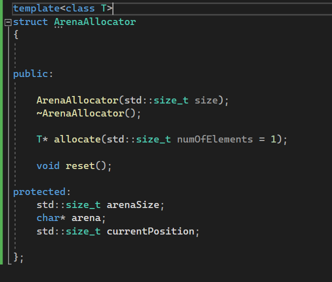 In order to improve the performance of the code, instead of getting a new memory from the heap by using the new keyword, an area of the memory can be allocated from the start and we can handle the memory operations there. For this I have created a very simple linear arena allocator. When its initialized, the arena pre-allocates some given size of memory. It also tracks where is the current offset is. When the allocate function gets called it returns a pointer in memory taking mind of the offset then increases the offset by the size of the type and by the amount of the elements, meaning if it is an array array size times the size of the type. And there is also a reset function that resets the current index to 0.